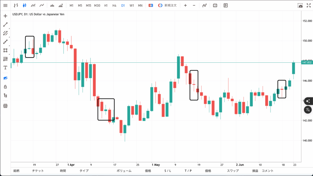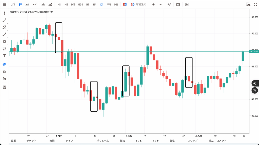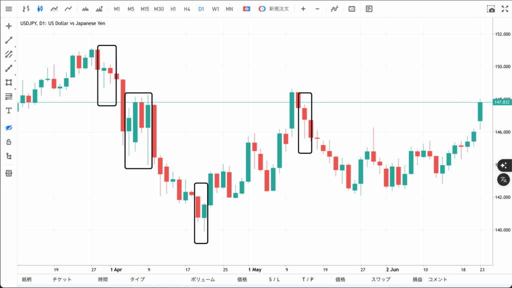 はじめは、動きが比較的わかりやすいドル円の日足から始めるのがオススメです。