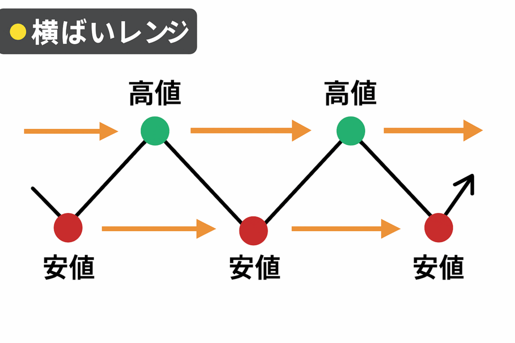 | 横ばい(レンジ) | 上がったり下がったりをくり返す | 横に動く波 |
