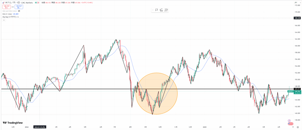 高いところと低いところが同時に上がったり下がったりするタイミングと、移動平均線の向きが変わるタイミングが、ほとんど同じになっているのがわかりますね。