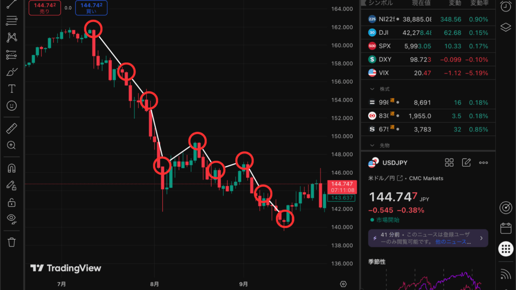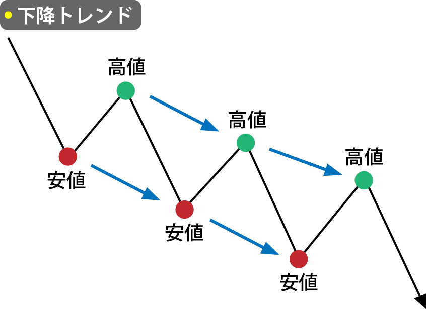 チャートを見たときに、「高いところ(高値)」と「低いところ(安値)」がどちらも前より少しずつ下がっているかどうかをチェックしてみましょう。