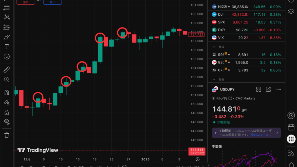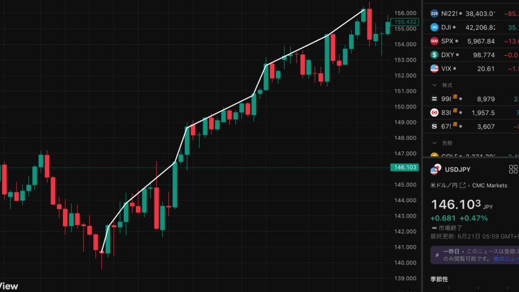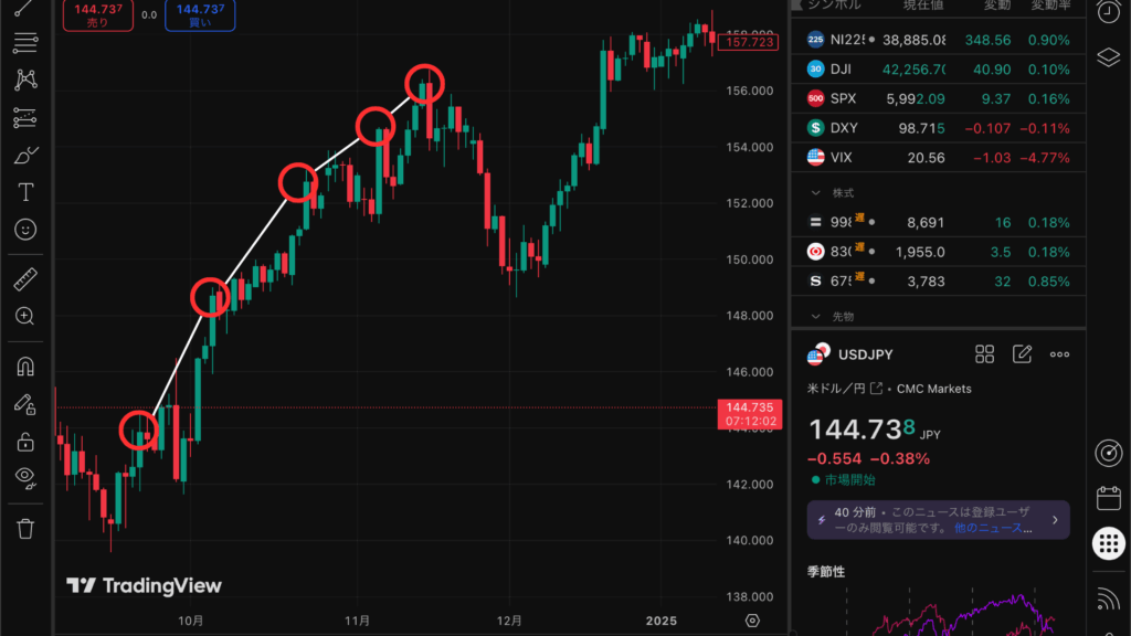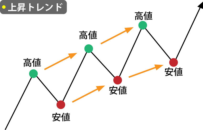 チャートを見たときに、「高いところ(高値)」と「低いところ(安値)」がどちらも前より少しずつ上がっているかどうかをチェックしてみましょう。