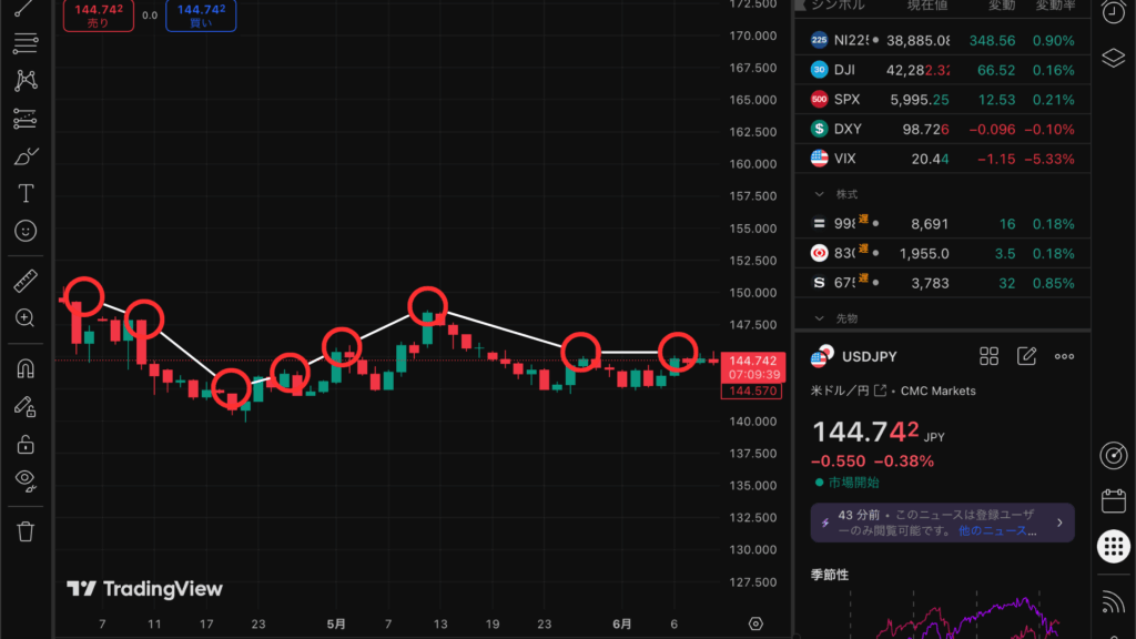 チャートを見て、「高いところ同士」や「低いところ同士」、または「高いところと低いところ」が同じあたりで止まっている場所を見つけて、そこにラインを引いてみましょう。