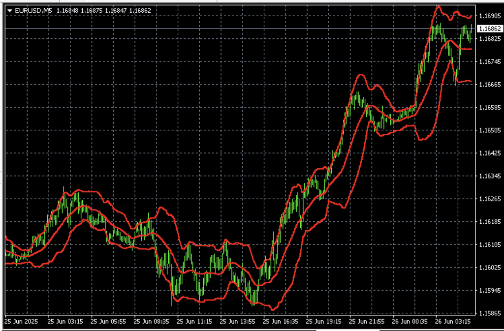 ボリンジャーバンドは、トレンドやボラティリティ(値動きの幅)を分析し、値動きの「強さ」や「方向性の変化」を捉えるために使われるテクニカル指標のひとつです。移動平均線を中心に、標準偏差で計算された上下のバンドで構成され、価格の変動範囲やトレンドの方向性を視覚的に把握できます。バンドは通常、中心の移動平均線から±1σ、±2σ、±3σと段階的に外側に描かれ(画像の赤線上下)、それぞれ以下のような統計的な意味を持っています。