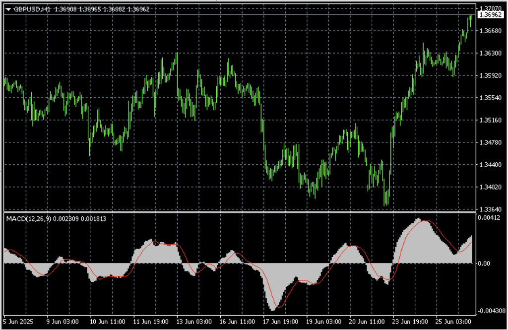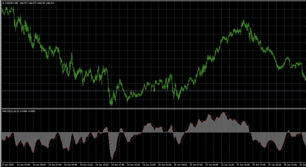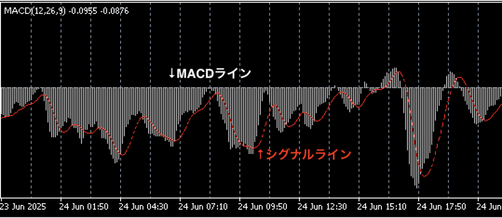 「短期的な平均の動きと、長期的な平均の動きの差」を表す線で、つまり、今の勢いが強いのか弱いのかをざっくり教えてくれる線。例えるなら…短距離ランナー(短期)と長距離ランナー(長期)のスピード差を見て、「今は勢いが出てきたのか?それとも失速し始めたのか?」をチェックしてるイメージです。