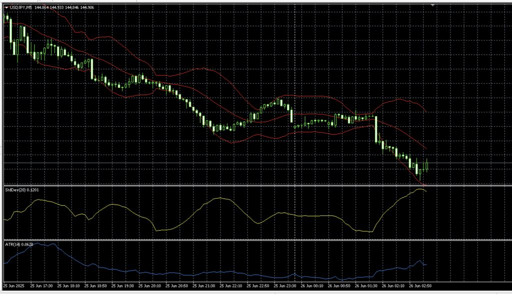 - 順張り:バンド幅が拡大し、ローソク足が+2σや-2σの外側で終値をつけた場合、トレンドの方向に順張りでエントリーする、などの判断に使います。