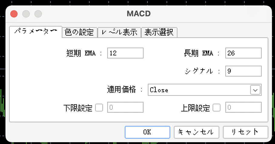 デフォルトで表示する場合は添付画像のようにグラフと赤線での構成ですが、初心者の方はパラメータを以下のように設定すると良いでしょう。