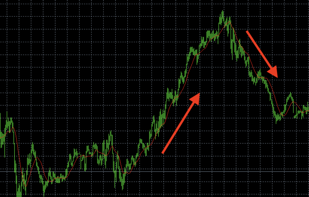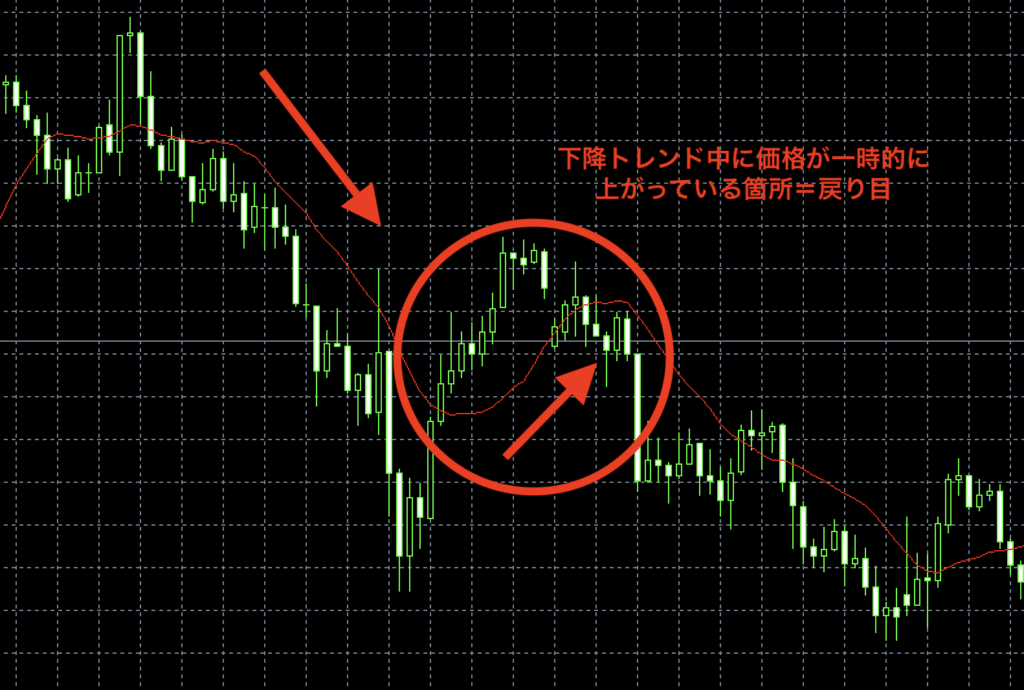 - 画像の赤い線=移動平均線が下向き=下降トレンドと判断