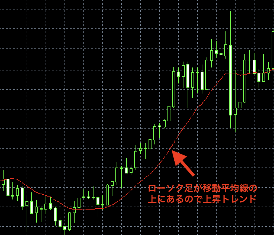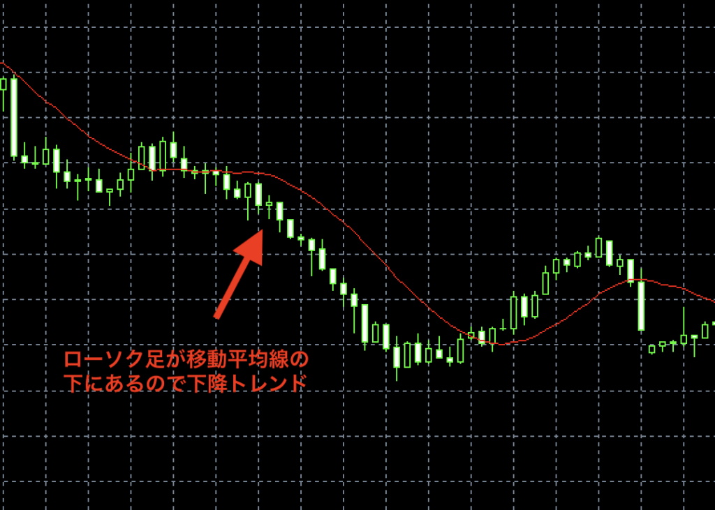 ローソク足が移動平均線の上にあれば上昇トレンド、下にあれば下降トレンドと見なすことができ、これを元に取引を行う判断をします。