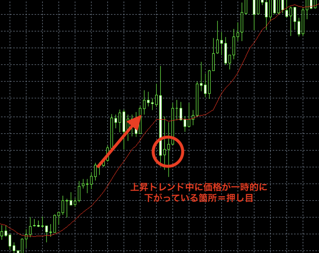 トレンドの押し目(上昇トレンドで価格が一時的に下落すること)や戻り目(下降トレンドで価格が一時的に上昇すること)で、移動平均線を参考に売買タイミングを計ります。