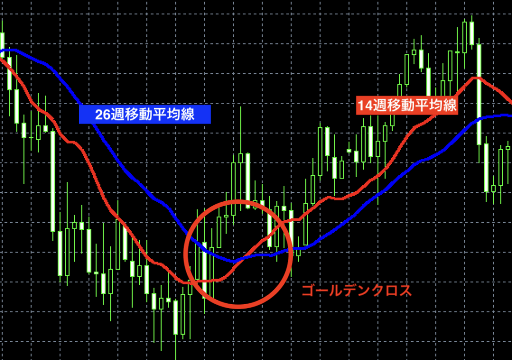 移動平均線は1本だけでなく複数ひくことができます。例えば以下のように移動平均線の周期を14にしたものを1本、26週にしたものを1本引くと、「ゴールデン・クロス」という買うべきタイミングを見つけることができるのです。