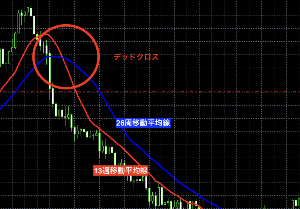 また、逆に計算期間の短い移動平均線が計算期間の長い移動平均線を下抜けることを「デッド・クロス」といい、売りシグナルといって売るべきタイミングを見つけることもできます。