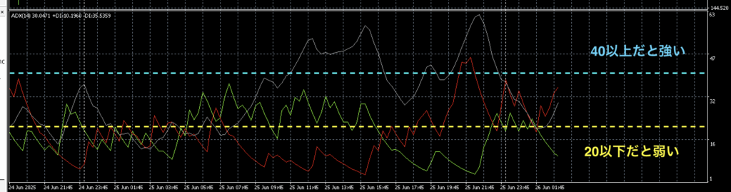 数字が20以下=弱い/40以上=強いトレンドと見てとることができます。